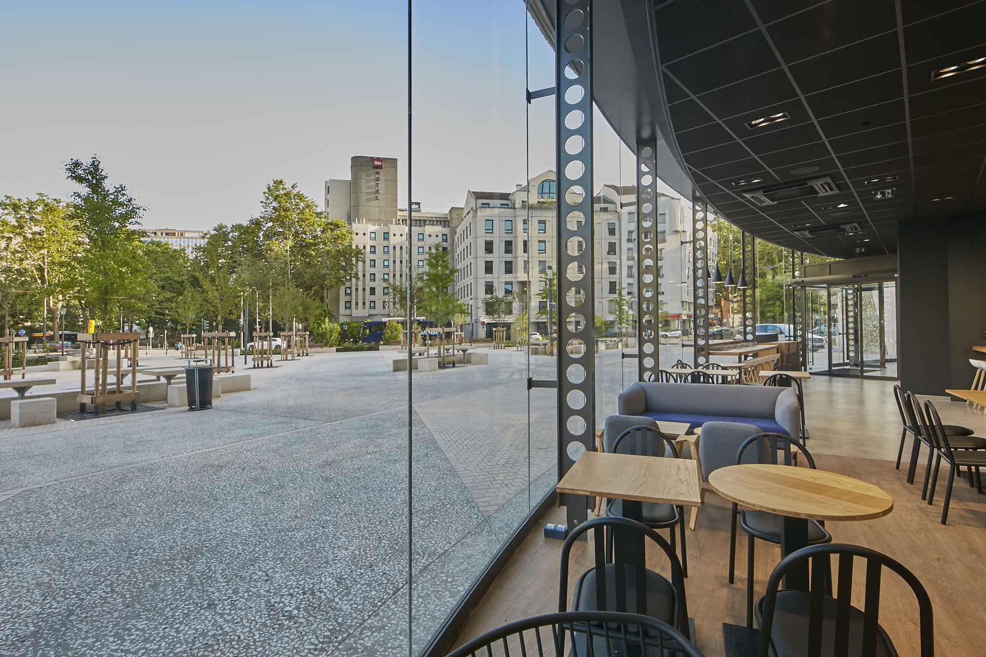 Posté le 03/09/2022 à 09:20" Jolie terrasse sur une place avec vue dégagée sur l'hôtel Radisson Blu. Section d'options de petit-déjeuner sains. "