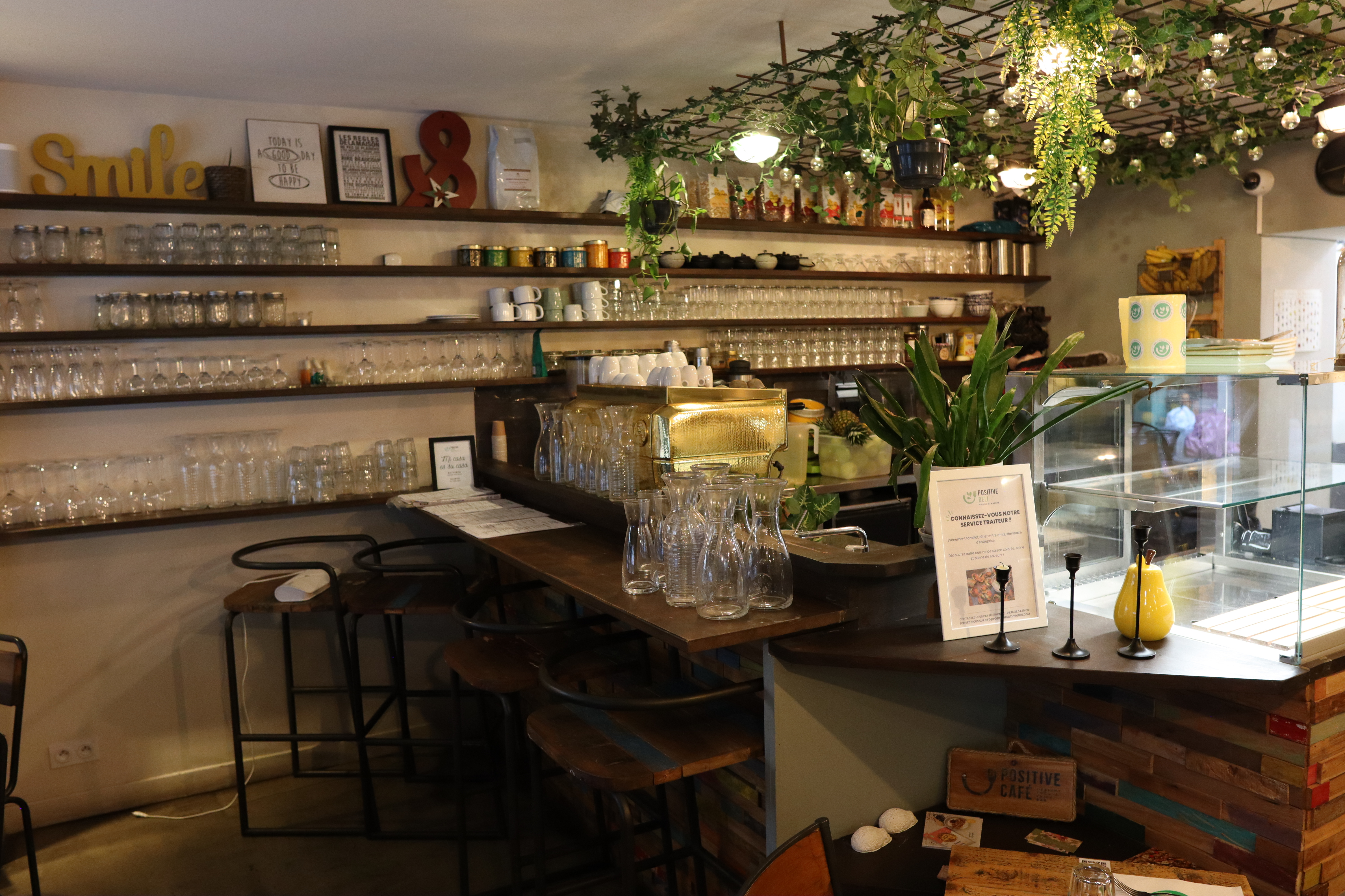 Mercredi 15 janvier, après quelques semaines de fermeture pour travaux, je suis entrée à Positive Café ;cette fois ci, j'étais seule, prête à me délecter et puis emporter pour toute la famille. Quelle malheureuse surprise de constater que les mets chauds étaient en mauvais état ! Les légumes sentaient affreux ! Sûrement il n'y a eu aucun contrôle sur la durée d'exposition.! Je pense que ces légumes étaient préparés deux jours auparavant. J'ai perdu l'envie et le respect que j'avais pour ce lieux.
